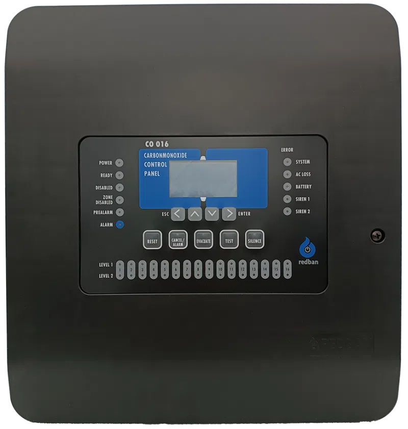 CO-016 Karbonmonoksit Kontrol Paneli, CO540 dedektörlerinden gelen ölçüm verilerini işlemek ve oluşturulan senaryoya göre üç seviyeli kontrol gerçekleştirmek üzere tasarlanmıştır. Dedektörlerde tespit edilen gaz seviyelerine göre üç farklı kontrol sağlar. Bu gaz seviyeleri için eşik değerler kurulum sırasında ayarlanır (daha sonra değiştirilebilir). İlk iki eşik değeri aşıldığında fanlar aktif hale gelir ve eğer ortamda bulunan gazı tahliye etmek mümkünse, sistem alarm durumuna geçmeden normal pozisyona döner. Üçüncü seviye eşiği aşıldığında, kontrol paneli alarm durumuna geçer ve resetlenene kadar bu pozisyonda kalır. Bu şekilde, ortamda bulunan gaz kritik seviyelere ulaşmadan gaz seviyesi kontrol altına alınır.